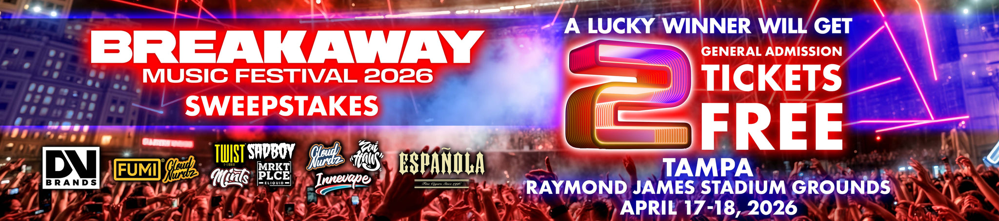 5. Prizes: Grand Prize Award (maximum 1 prize award): One (1) eligible entrant designated as the prize winner shall be awarded the following prize award - Two (2) General Admission two day tickets to Tampa Breakaway 2026 event - valued at $480.00 USD total